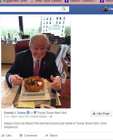 Then I saw that Drumpf posed with a taco salad and said “I love Hispanics.” Seriously. I’m not going to link to his post, he deserves NO publicity, he’s a bigot and a bag of crap opportunist. So here’s a screenshot so no one can claim I’m making it up.